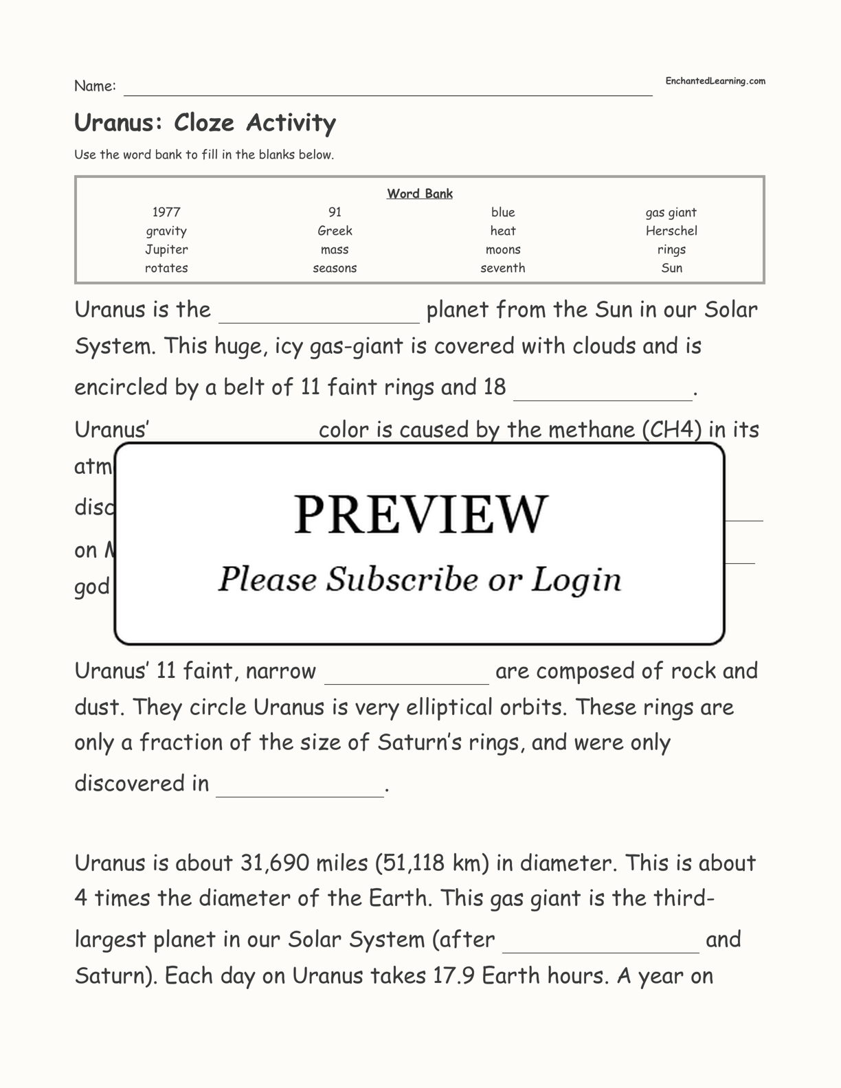 Use the word bank to fill in the blanks in this Uranus cloze activity. This is a printable worksheet.