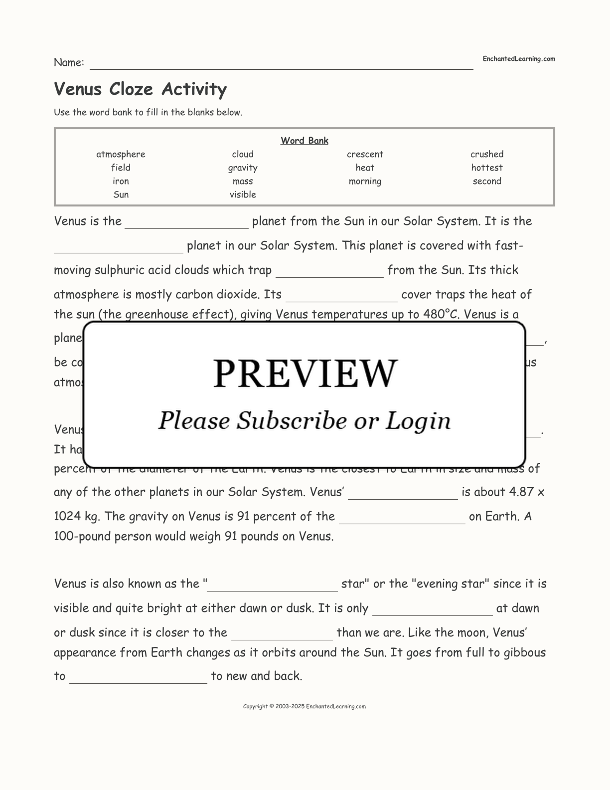 Use the word bank to fill in the blanks in this Venus cloze activity. This is a printable worksheet.
