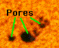 PORE A pore is a small sunspot that doesn't have a penumbra. Pores are up to about 1,500 miles (2,500 km) across and are lighter than a sunspot's umbra. |