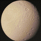 TETHYS Tethys is one of the larger of the 18 moons of Saturn. This icy moon is heavily cratered and has many cracks and plains. It has a diameter of about 600 miles (1000 km). One huge ice trench, the Ithaca Chasma, is 40 miles (65 km) wide and extends over 3/4 of the way around the moon. It orbits at a mean distance of about 180,000 miles (294,000 km) from Saturn. Its orbital period is 45.3 hours. It was discovered by Cassini in 1684. It has a water-ice interior composition (density =1.21 gm/cm3). The surface temperature is -187° C = -305° F. |