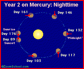 Each sidereal day on Mercury takes 58.65 Earth days; it takes Mercury 58.65 days (2/3’s of its year) to rotate around its axis once. One day on Mercury seems to last two Mercurian years (or 176 Earth days), i.e., sunrise to sunrise. It is daytime for one Mercurian year, and nighttime for one Mercurian year. (It used to be thought that Mercury always kept the same side side towards the sun, but this is not true.)