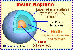 Neptune is composed mostly of ice, hydrogen and helium. It may have a small, rocky core, and an icy mantle that blends into the atmosphere.