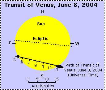 The June 2004 transit of Venus lasted over 5 hours, starting at 5:13 Universal Time (UT) and ending at 11:25 UT.