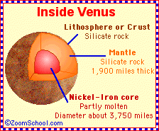 Venus has a rocky crust, a thick basaltic rock mantle and a nickel-iron core. There is no surface water. The surface of Venus has been mapped through its cloud layer using radar. The surface of Venus is covered with roughly 20 percent lowland plains of solidified lava, 70 percent rolling uplands, and 10 percent highlands (volcanos, craters, mountains). The two major plains are called Aphrodite Terra Highlands (about half the size of Africa) and Ishtar Terra (a lava-filled basin which is bigger than the United States). At the surface, there are relatively slow winds.
