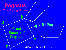 Pegasus (the flying horse) is a large northern hemisphere constellation. Delta Pegasi is shared with the constellation Andromeda. 51 Pegasi (51 Peg), off the Great Square of Pegasus, is a nearby, Sun-like star that has been found to have an orbiting planet.