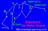 [Abbreviation: Aqr] Aquarius (the water bearer) is a constellation of the zodiac. This faint constellation is seen along the ecliptic. The sun passes through Aquarius from mid-February until mid-March. There are many interesting celestial objects in this large constellation, including globular clusters (M2 and M72), planetary nebulae (NGC 7009 and NGC 7293), the star group M73, a double star (zeta Aqr). Aquarius is the radiant for the meteor showers: March Aquarids, Delta Aquarids, Eta Aquarids, and Iota Aquarids. Alpha Aquarii (the brightest star in Aquarius) is called Sadalmelik (meaning the Lucky One of the King) and beta Aquarii (the second-brightest star in Aquarius) is named Sadalsuud (meaning the Luckiest of the Lucky); they are twin supergiants.