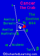 [Abbreviation: Cnc] Cancer (the crab) is a very faint constellation of the zodiac that is shaped like a crab. Cancer is seen along the ecliptic and is located between Leo and Gemini. At the center of the crab’s shell is a huge open cluster, the Beehive cluster, also known as Praesepe (M44). The open cluster M67 is nearby. The brightest star in Cancer is Acubens (meaning claw); the second-brightest is Al Tarf (meaning tip).