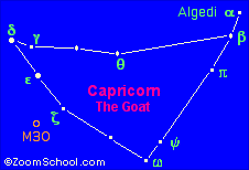 [Abbreviation: Cap] Capricornus (the goat) is a constellation of the zodiac. Capricorn is seen along the ecliptic between Sagittarius and Aquarius. The brightest stars in Capricornus are Prima Giedi (Alpha 1 Cap) and Secunda Giedi (Alpha 2 Cap). The globular cluster M30 is in Capricorn.
