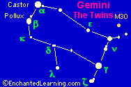 [Abbreviation: Gem] Gemini (also known as “The Twins”) is one of the constellations of the zodiac, located along the ecliptic between Taurus and Cancer. The brightest stars in Gemini are Castor (a sextuple star - three double stars) and Pollux (a 1st magnitude yellow star). The star cluster M30 is in Gemini. The open cluster M35 also is located in Gemini. The Geminid meteor shower seems to radiate from Gemini.