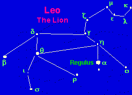 [Abbreviation: Leo] Leo (the lion) is a constellation of the zodiac that is shaped like a lion. Leo is seen along the Milky Way in the Northern Hemisphere along the ecliptic between Virgo and Cancer. The brightest star (Alpha Leo) in Leo is Regulus (meaning “little king”). The second-brightest star (Beta Leo) is Denebola (meaning “tail of the lion”), and the third-brightest star (Gamma 1 Leo) is Algieba (meaning “forehead”). The spiral galaxies M65, M66, M95, M96, and the elliptical galaxy M105 are nearby.