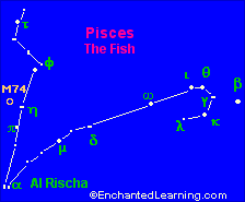 [Abbreviation: Psc] Pisces (the fish) is a faint equatorial constellation of the zodiac. Pisces is seen along the ecliptic between Aries and Aquarius. The brightest star in Pisces (Alpha Psc) is Al Rischa (or Alrisha), the second-brightest-star (Beta Psc) is Fum al Samakah. The spiral galaxy M74 is in Pisces.