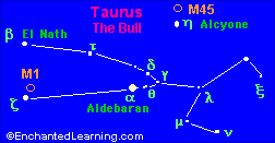 [Abbreviation: Tau] Taurus (the bull) is a constellation of the zodiac. This constellation is seen along the ecliptic between Aries and Gemini. The brightest star (Alpha Tau) in Taurus is Aldebaran, which is one of the bull’s eyes (Aldebaran is the 13th brightest star in the sky). The second-brightest star in Taurus (Beta Tau) is Alnath, the third brightest (Gamma Tau) is Hyadum I.
