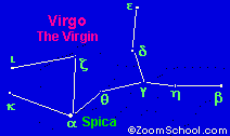 [Abbreviation: Vir] Virgo (the virgin) is a constellation of the zodiac. It is located along the ecliptic between Leo and Libra. Virgo is seen along the ecliptic. The brightest star in Virgo is Spica (meaning “ear of wheat”). Virgo is the second-largest constellation (of the 88 constellations), after Hydra.