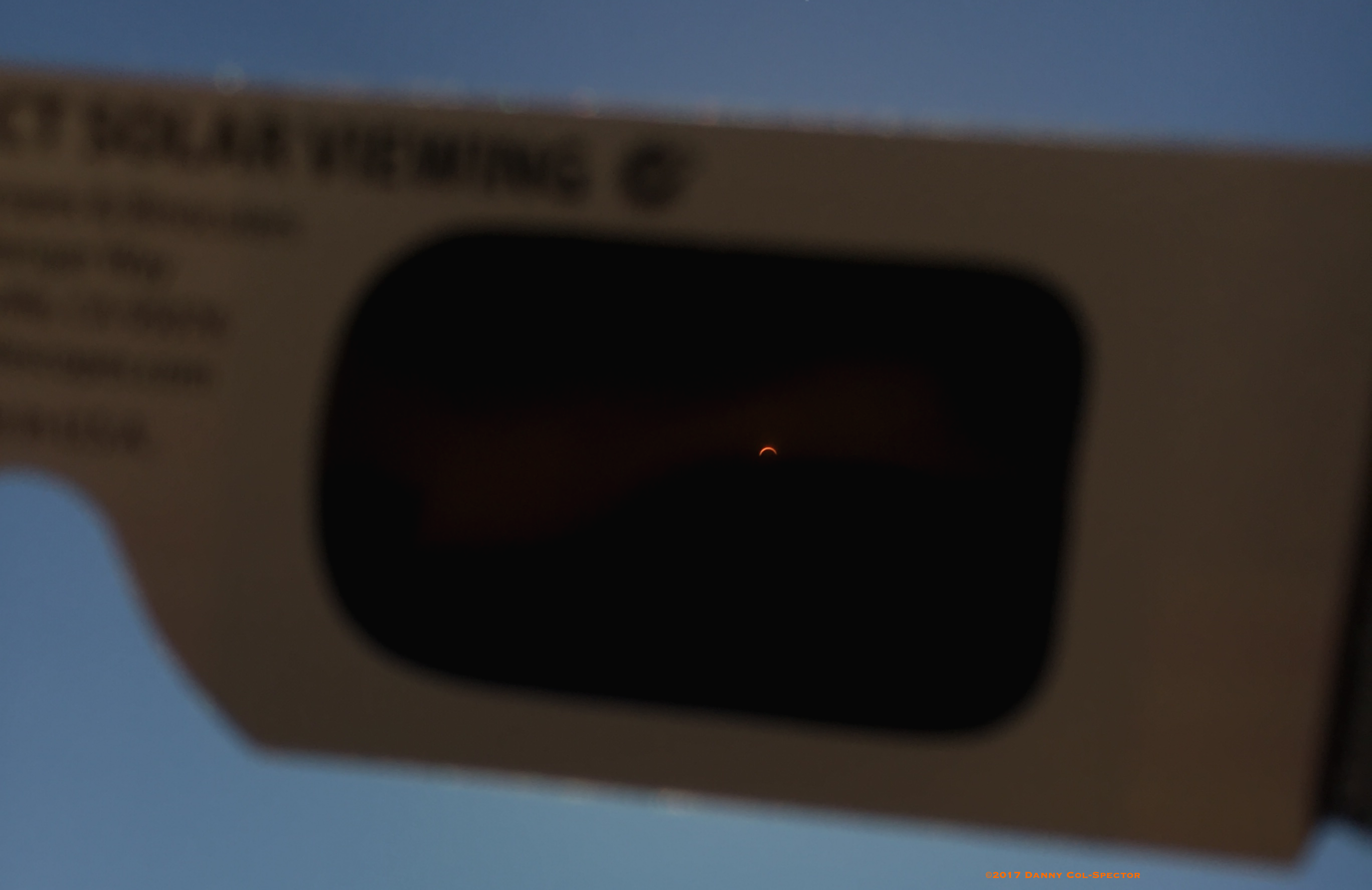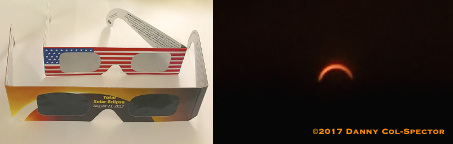 Typical eclipse glasses, and a photo of the solar eclipse through them.