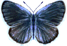 KARNER BLUE BUTTERFLY The Karner Blue Butterfly (Lycaeides melissa samuelis) is a small, blue butterfly that has a wingspan of about 1 inch (2.5 cm). This endangered species lives in oak savannas and pine barrens and is associated with wild lupine (Lupinus perennis, a plant that the caterpillar eats). Adults drink the nectar of horsemint, butterflyweed, and bachelors button. The adult male (pictured above) and female have a very different appearance. The upper sides of the male's wings are silver to dark blue with white and black margins. The upper sides of the female's wings are gray-brown to blue, with some bands of orange crescents along the bottom of the hind wing, and white and black margins. The underside of the wings of both sexes are grayish in colorwith orange crescents and some metallic spots along the bottom of both hind wings. The green caterpillar is tended by ants; these ants collect a sugary liquid that is secreted by the caterpillar, and the ants protect the caterpillar from some predators and parasites. |