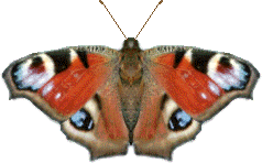 PEACOCK BUTTERFLY The peacock butterfly (Inachis io) is a common butterfly from temperate parts of Europe (including Britain) and Asia. This butterfly makes a hissing sound when it is alarmed (usually upon seeing a bird); it makes the sound by rubbing its wings together. The wings are brownish-purple with a bright eyespot on each wing (the wings look a bit like an owl's face). The undersides of the wings are mottled grayish-brown. The larval host plant is the stinging nettle; the caterpillar is black with spines. Classification: Family Nymphalidae (brush-footed butterflies), genus Inachis, species I. io. |