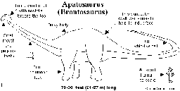 Apatosaurus and some of the other large sauropods (the huge long-necked plant-eaters) needed to have large, powerful hearts and very high blood pressure in order to pump blood up the long neck to the head and brain. The heads (and brains) of Apatosaurus was held high (many meters) above its heart. This presents a problem in blood-flow engineering. In order to pump enough oxygenated blood to the head to operate Apatosaurus’ brain (even its tiny sauropod brain) would require a large, powerful heart, tremendously high blood pressure, and wide, muscular blood vessels with many valves (to prevent the back-flow of blood). Apatosaurus’ blood pressure was probably over 400 mm Mercury, three or four times as high as ours.