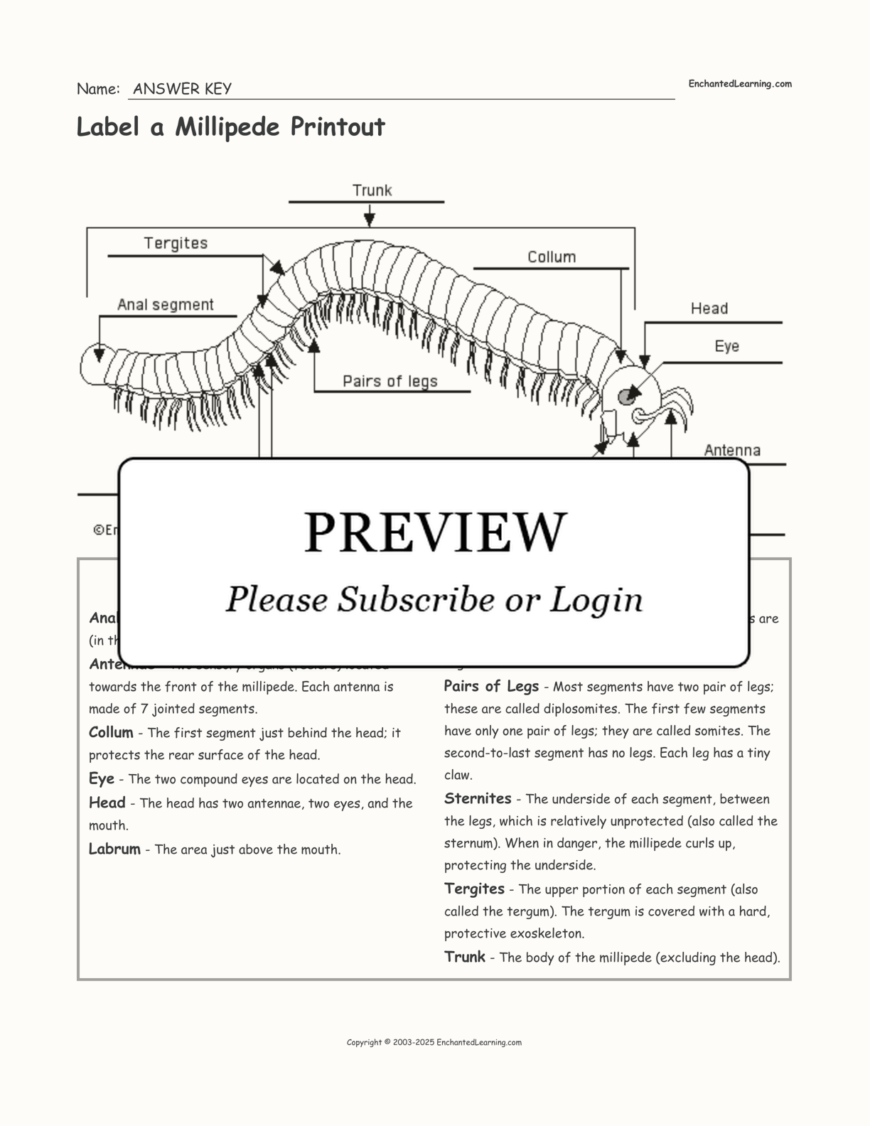 Label the millipede - an external anatomy diagram printout.