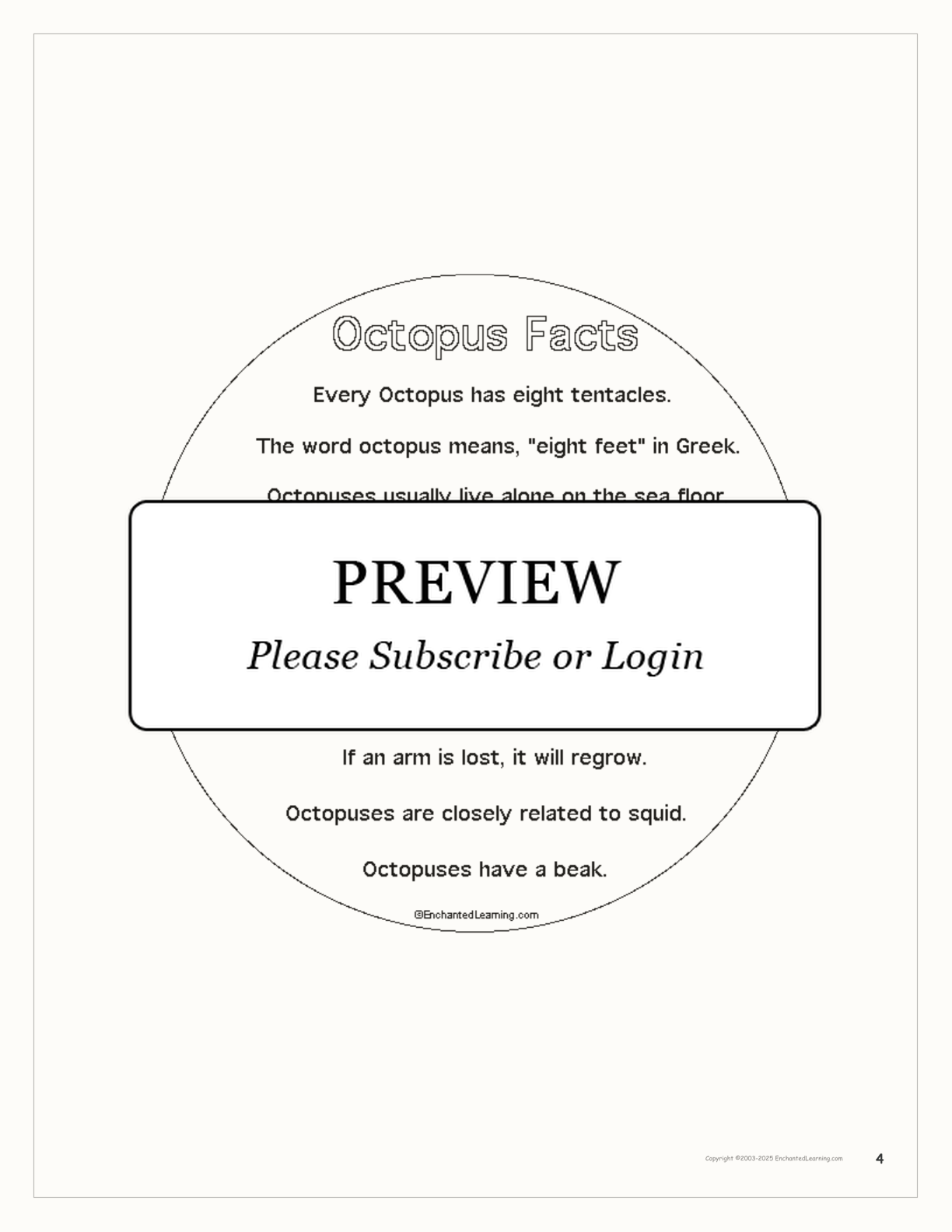 This is a short book about the octopus to print, for early readers. It has pages on octopus anatomy, a connect-the-dot activity, a page on the most poisonous octopus, octopus facts, and octopus questions.