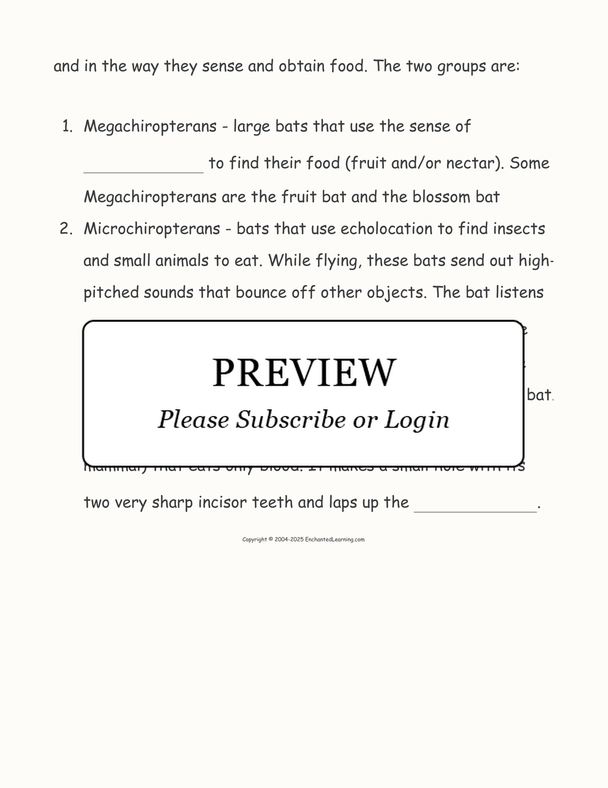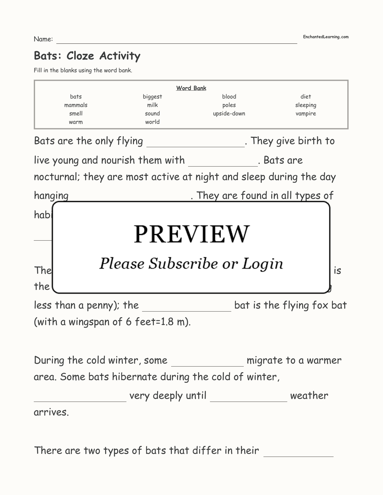 Use the word bank to fill in the blanks in this Bats cloze activity. This is a printable worksheet.