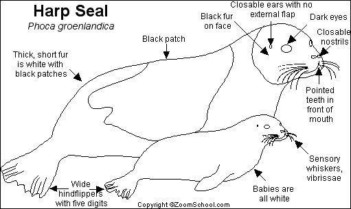 Anatomy: The Harp Seal has short, thick white fur with black patches and a black face. The young are all white. These seals grow to be up to 5.5 feet (1.7 m) long and can weigh up to 285 pounds (130 kg); females are a bit smaller. The whiskers (called vibrissae) contribute to the seal's sense of touch. The nostrils are closed in the resting state.