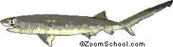 SCHOOL SHARK Galeorhinus galeus is also known as the Soupfin Shark and Tope. This common shark is gray on top and white underneath; it frequently swims in schools. This harmless shark has a slim body , a small second dorsal fin, and a large top lobe on its tail. The Soupfin shark is up to 6.5 ft (2 m) long and has a life span of over 50 years. It eats squid, octopus, and fish. The Soupfin lives in temperate waters almost worldwide and migrates long distances to cooler water for giving birth. The Soupfin shark reproduces via aplacental viviparity, having litters of up to 52 pups after a gestation period of one year. Pups are about 12-14 inches (30-35 cm) long at birth. Females are mature at 8-10 years and have a low reproductive rate. It is fished for its fins, meat and liver oil. Galeorhinus galeus was named by Linnaeus in 1758. Classification: Order Carcharhiniformes (ground sharks), Family Triakidae (houndsharks, topes, whiskery sharks). |
