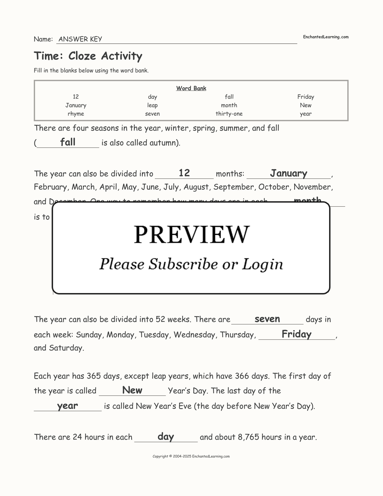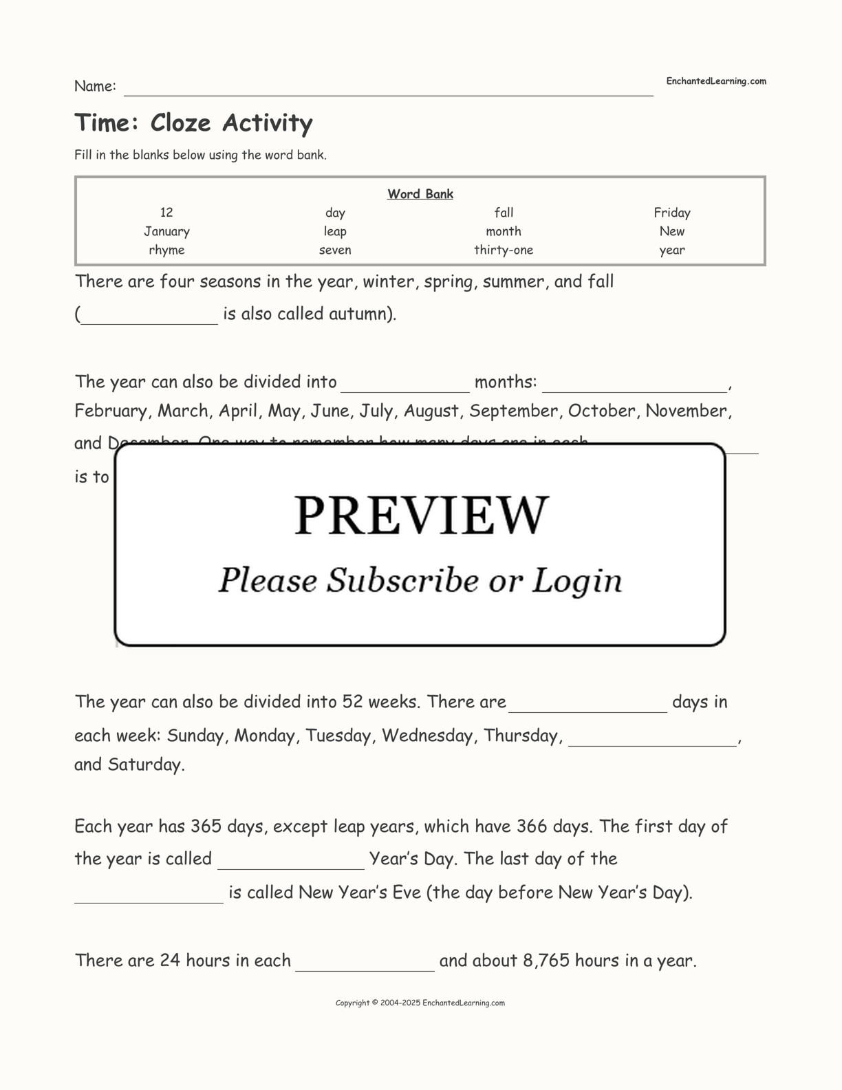 Use the word bank to fill in the blanks in this Time cloze activity. This is a printable worksheet.