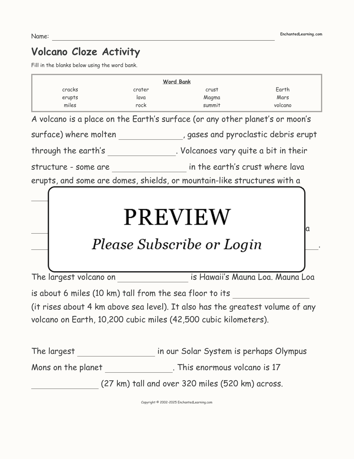 Use the word bank to fill in the blanks in this volcano cloze activity. This is a printable worksheet.