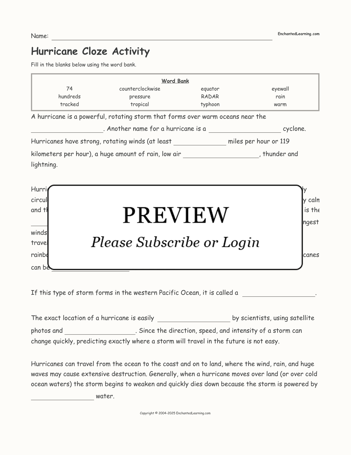Use the word bank to fill in the blanks in this hurricane cloze activity. This is a printable worksheet.