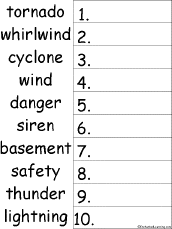 Put 10 Tornado Words in Alphabetical Order - Worksheet Put 10 tornado-related words in alphabetical order. The words are: tornado, whirlwind, cyclone, wind, danger, siren, basement, safety, thunder, lightning. Go to the answers. |
