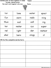 Tornado Word Pieces Puzzle In this puzzle, combine pairs of word segments to make tornado-related spelling words. Words: tornado, funnel, thunder, lightning, barometer, shelter, waterspout, meteorology, warning, cyclone, supercell, cloud. Or go to the answers. |