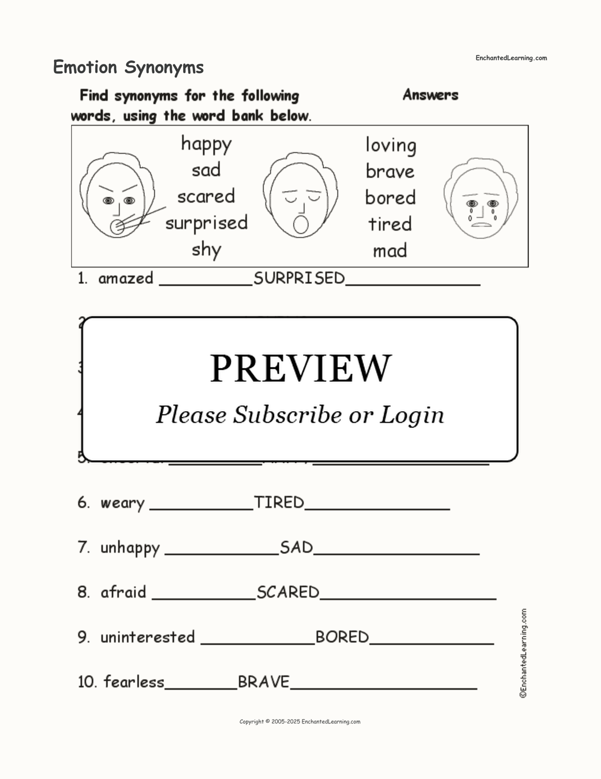 Use the word bank to find synonyms of words for emotions in this printable worksheet.