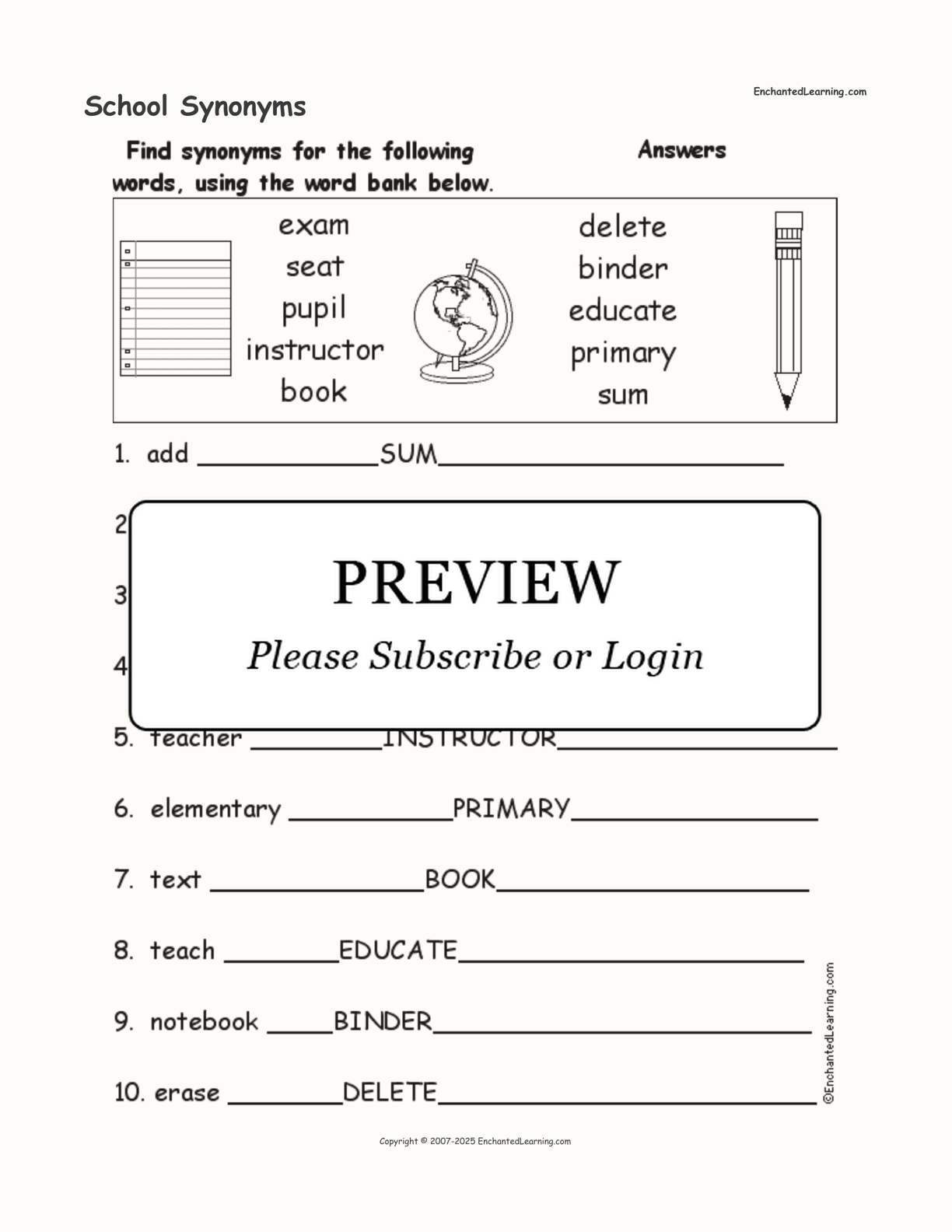 Use the word bank to find synonyms of school-related words in this printable worksheet.