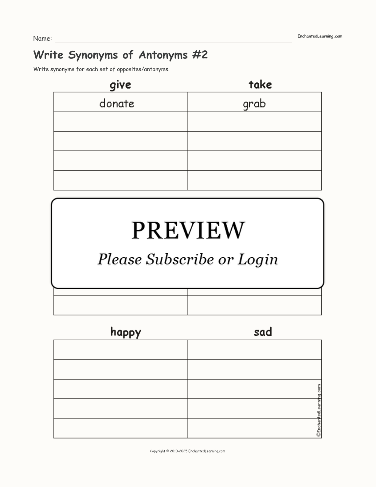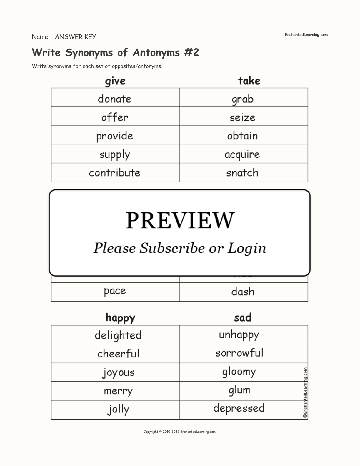Write synonyms for each set of opposites/antonyms in this printable worksheet.