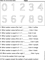 Numbers Follow the Instructions Draw and color numbers according to simple directions, such as, "What number comes after two?_______ Color it yellow." Or go to the answers. |