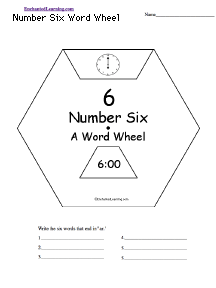 Make a wheel about the number six using this 2-page print-out; it consists of a base page together with a wheel that spins around. When you spin the wheel, things related to the number six appear, including 6:00, sides of a hexagon, legs on an insect, 6 sides of a bee's honeycomb, 6 in Roman numerals, 6 tally marks. The student then writes down the things related to the number six.