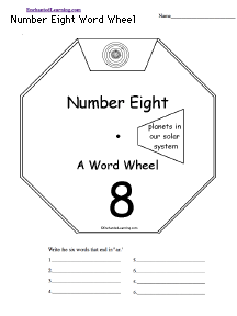 Make a wheel about the number eight using this 2-page print-out; it consists of a base page together with a wheel that spins around. When you spin the wheel, things related to the number eight appear, including planets in our solar system, arms on an octopus, notes in an octave, sides of an octagon, 8:00, legs on a spider, 8 tally marks, and 8 in Roman numerals. The student then writes down the things related to the number eight.