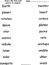 Match the Astronomy Anagrams Draw a line from each astronomy-related word to its anagram. Words: Earth/heart, planet/platen, rotates/toaster, space/paces, star/rats, cosmic/comics, nebula/unable, lunar/ulnar, solar/orals, sunspots/unstops. Or go to the answers. |