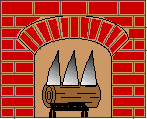 Make a fireplace from two brown paper grocery bags and red tempera paint.