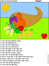 Cornucopia: Follow the Instructions Color the cornucopia according to simple directions, such as, "Color the pair of pears yellow." Or go to the answers. |