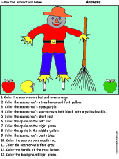 Scarecrow: Follow the Instructions Draw and color a scarecrow according to simple directions, such as, "Color the scarecrow's hat and nose orange." Or go to the answers. |