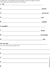 Write Fall Words by Category Write 5 fall words for each category. The categories include: Fall Holidays, Fall Activities, Fall Clothing, Fall Symbols, Fall Food, Fall Birthdays, Fall Weather, and Miscellaneous Fall words. Or go to sample answers. |