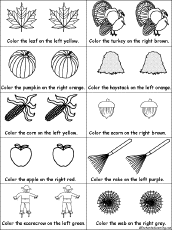 Color the Fall Words on the Left or Right Color the fall items on the left or the right. For example, "Color the leaf on the left yellow." Items: leaf, turkey, pumpkin, haystack, corn, acorn, apple, rake, scarecrow, web. Or go to the answers. |