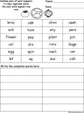 Vegetable Word Pieces Puzzle In this puzzle, combine pairs of word segments to make vegetable-related spelling words. Words: broccoli, cabbage, carrots, cauliflower, celery, eggplant, lettuce, peppers, potato, spinach, squash, zucchini. Or go to the answers. |