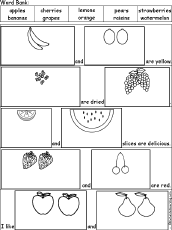 Picture Cloze for Fruit Words - Printable Worksheet Fill in the missing words in the text given a picture prompt, using the fruit word bank. The words are: apples, bananas, cherries, grapes, lemons, oranges, pears, raisins, strawberries, watermelon. Go to the answers. |