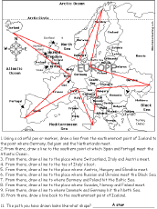 Europe #2: Follow the Instructions Draw a path in Europe according to simple directions, such as, "Draw a line back to the southernmost point of Iceland." Or go to the answers. Or go to a pdf of the worksheet and the answers. |