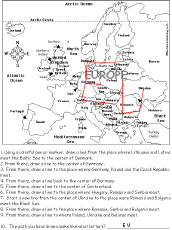Europe #4: Follow the Instructions Draw a path in Europe according to simple directions, such as, "Start a new line from the center of Ukraine to the place were Romania and Bulgaria meet the Black Sea." Or go to the answers. Or go to a pdf of the worksheet and the answers. |