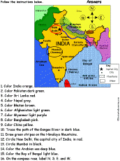 India: Follow the Instructions Color India according to simple directions, such as, "Trace the path of the Ganges River in blue." Or go to the answers. |