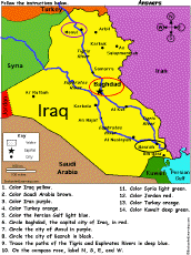 Iraq: Follow the Instructions Color Iraq according to simple directions, such as, "Trace the paths of the Tigris and Euphrates Rivers in deep blue." Or go to the answers. |