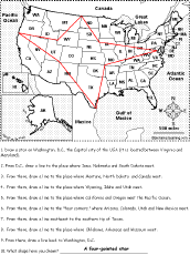 United States of America: Follow the Instructions #2 Draw lines on the USA map according to simple directions, such as, "Draw a line back to the easternmost point of Maine." Or go to the answers. Or go to a pdf of the worksheet and the answers. |